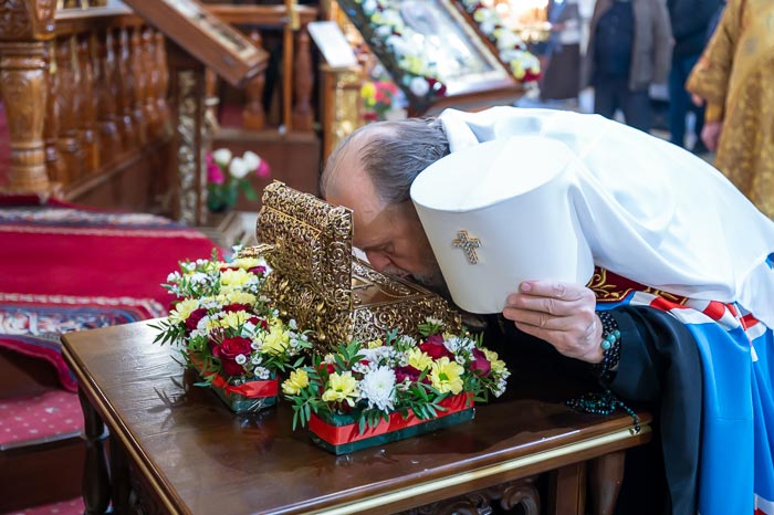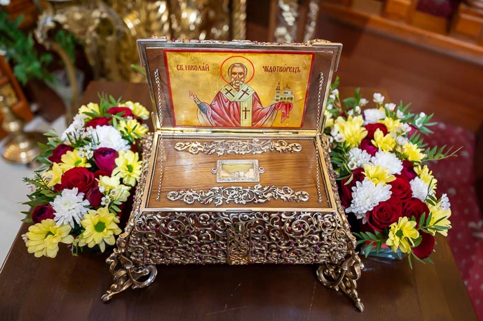 Перед началом Литургии для молитвенного поклонения и духовного укрепления верующих из алтаря собора был изнесен ковчег с мощами святителя и чудотворца Николая.